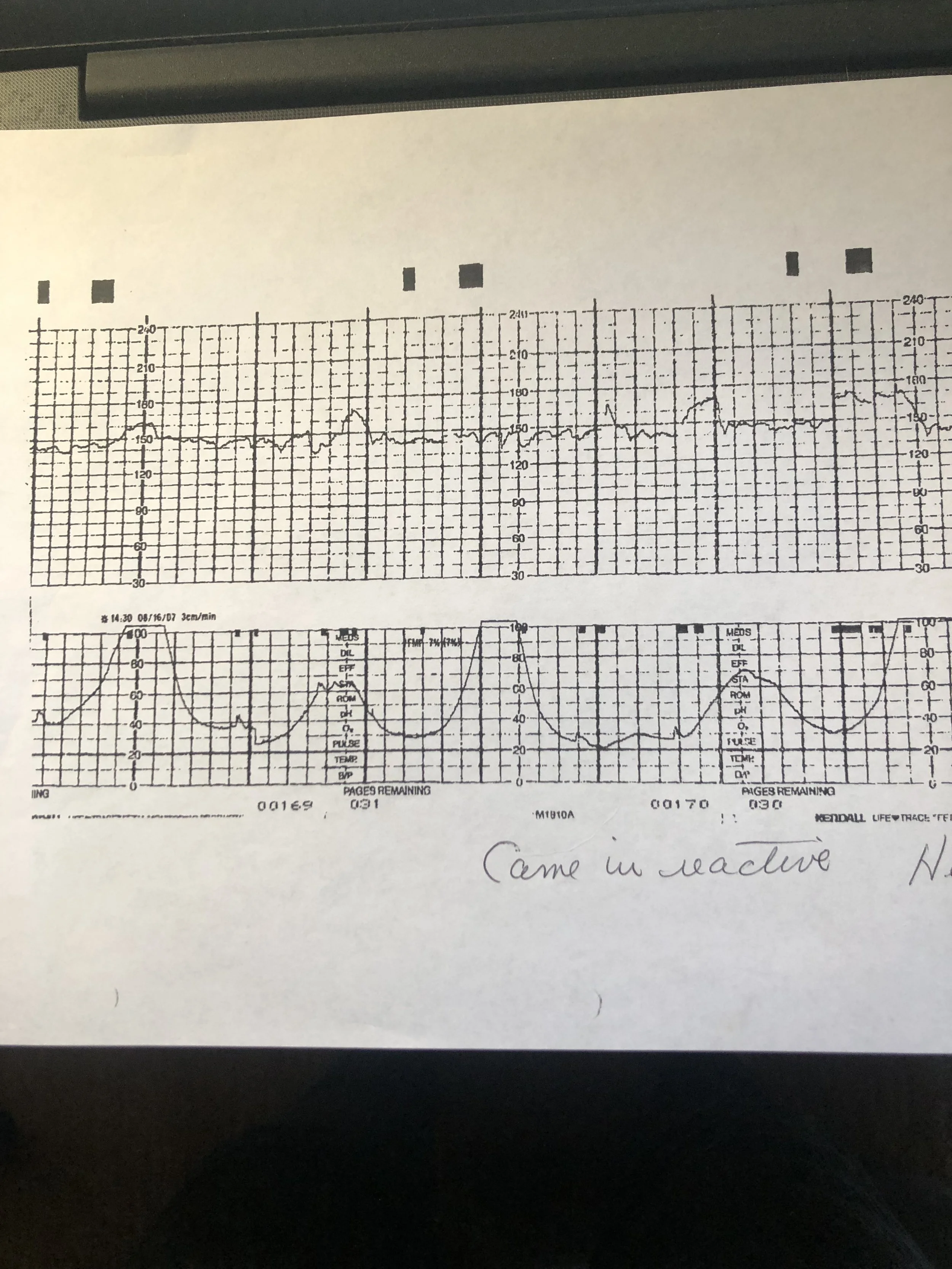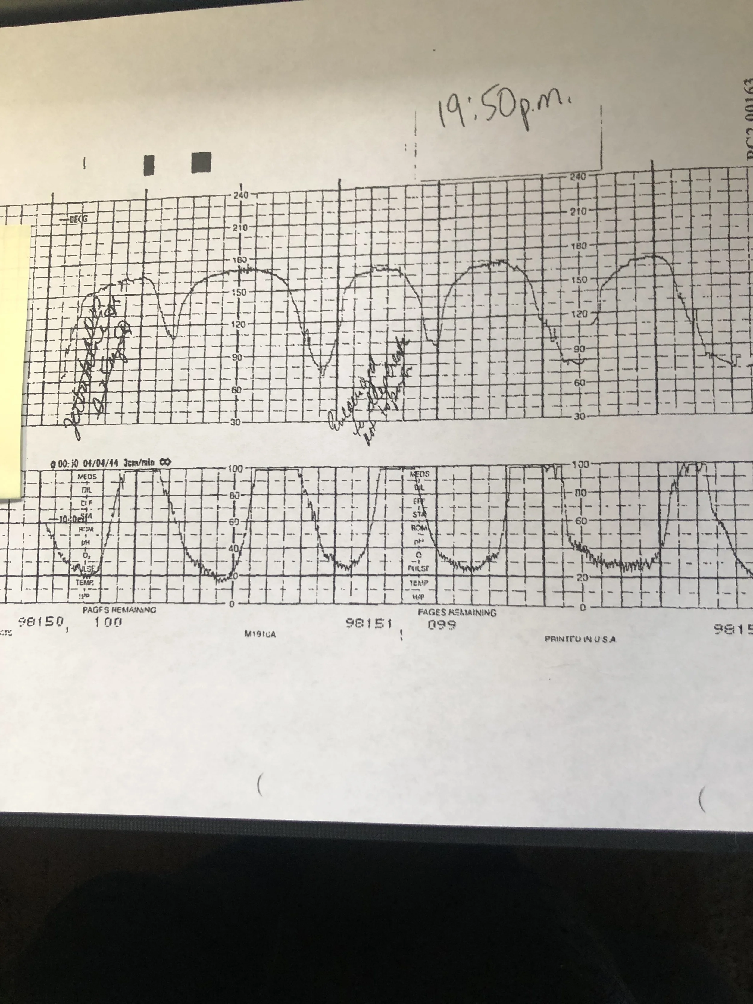 A nurse was concerned by the events and the departure of the doctor. She tore off a piece of the strip at 1949 and 1957 to show to Dr. Z. He finally called for a cesarean section at 1958, an hour and 23 minutes after the sudden bradycardia and absent variability.